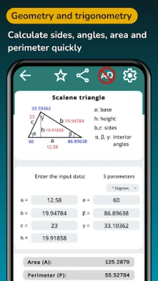 Už vás nebaví složité geometrické výpočty a záludné trigonometrické rovnice? Představujeme vám revoluční nástroj, který promění vaše pojetí matematiky. S naší komplexní trigonometrickou a geometrickou kalkulačkou máte veškeré potřebné nástroje na dosah ruky. Ať už potřebujete spočítat úhly, plochy, obvody nebo se ponořit do složitých trigonometrických identit, tato aplikace je vaším spolehlivým partnerem pro řešení problémů z jakéhokoli oboru.