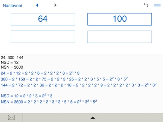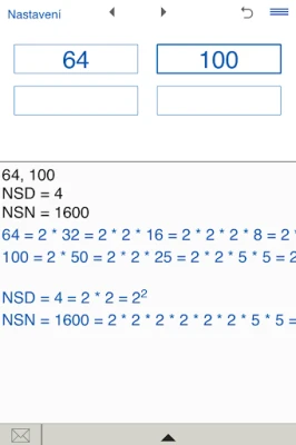 S aplikací Největší společný dělitel snadno vypočítáte největší společný dělitel a nejmenší společný násobek pro 2, 3 nebo 4 čísla. Rozkládejte na prvočísla, prohlížejte postup a ukládejte historii výpočtů.