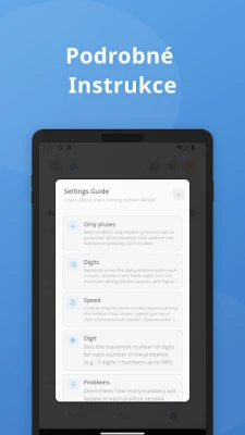 Pro optimální zážitek z tréninku si můžete vybrat mezi tmavým a světlým režimem, což zajišťuje pohodlí pro vaše oči a lepší soustředění v jakémkoli prostředí. Ať už používáte telefon nebo tablet, aplikace je plně optimalizována pro obě platformy, přičemž na velkých obrazovkách tabletu nabízí skutečně pohlcující a detailní trénink. Tento nástroj je ideální pro ty, kteří chtějí rychle zdokonalit své dovednosti v počítání zpaměti a práci s mentálním abakusem, a také pro každého, kdo hledá spolehlivého společníka pro každodenní cvičení základních matematických operací. Přeměňte svůj potenciál v realitu a staňte se mistrem čísel.