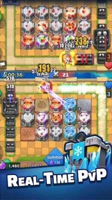 V režimu Bitva se připravte na ultimativní střet v reálném čase. Cílem je ochránit hrad před neúprosnými vlnami protivníků. Vyvolávejte náhodné věže, ničte nepřátele a sbírejte duše k posílení obranných linií. Spojujte identické věže pro jejich vylepšení a získejte drtivou převahu. Buďte rychlí, neboť poražení nepřátelé se brzy objeví u soupeře – porazte je dříve a rozdrťte jeho hrad! Nezapomeňte na boss raidy, upgradujte věže a využijte schopnosti hradu. Odměny jako trofeje, zlato a vzácné věže čekají na ty nejlepší, kteří stoupají žebříčky Battle Areny.