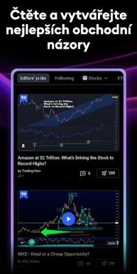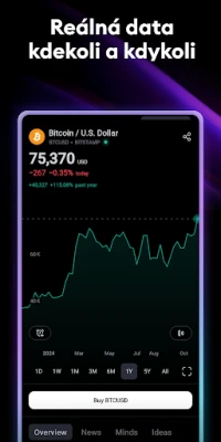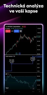 Ponořte se do nejaktivnější sociální sítě pro obchodníky a investory, kterou TradingView nabízí. Propojte se s miliony uživatelů po celém světě, sdílejte své pohledy a strategie a rozšiřujte své znalosti díky zkušenostem ostatních. Aplikace TradingView přináší prvotřídní grafy, které svou propracovaností překonávají mnohé desktopové platformy. S více než deseti typy grafů – od klasických liniových po specifické Renko a Kagi – a širokou paletou analytických nástrojů, indikátorů a kreslících objektů (včetně Gannových a Elliotových vln či klouzavých průměrů), získáte komplexní pohled na tržní dění. Všechny funkce a nastavení jsou dostupné bez kompromisů, přesně tak, jak je znáte z webové verze.