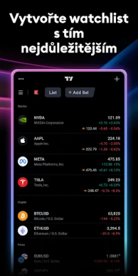 Vytvořte si osobní seznamy sledovaných instrumentů a buďte vždy v obraze. S flexibilními nastaveními můžete efektivně monitorovat akcie, měnové páry, komodity i kryptoměny. Díky propracovanému systému upozornění nezmeškáte žádnou důležitou událost na trhu, což vám umožní včas reagovat na změny a maximalizovat své investiční příležitosti. Veškerá vaše práce – uložené změny, oznámení, grafy a technické analýzy – je navíc automaticky synchronizována napříč všemi vašimi zařízeními, takže máte své obchodní prostředí neustále po ruce. Získejte přístup k reálným datům z více než 100 000 instrumentů z padesáti světových burz napříč kontinenty, včetně NYSE, LSE, NASDAQ a mnoha dalších. S TradingView máte kompletní finanční svět doslova na dlani.