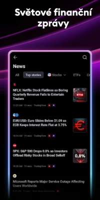TradingView vám otevírá bránu do světa finančních trhů s přístupem k profesionálním datům, která jsou získávána přímo od špičkových zdrojů. Získejte přehled o akciích, futures, populárních indexech, měnových párech, bitcoinu a CFD, stejně jako o cenách ropy, podílových fondech, dluhopisech a dalších komoditách. Mějte pod kontrolou globální burzy a sledujte klíčové světové indexy, jako jsou NASDAQ Composite, S&P 500, NYSE, Dow Jones, DAX, FTSE 100 nebo NIKKEI 225, a to vše v reálném čase.